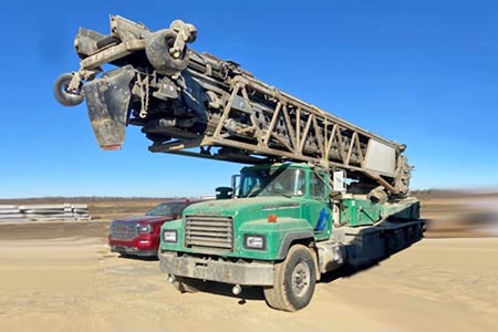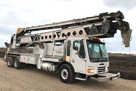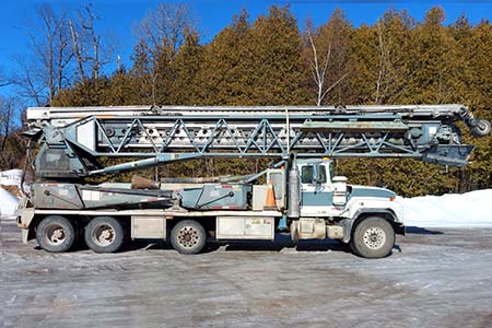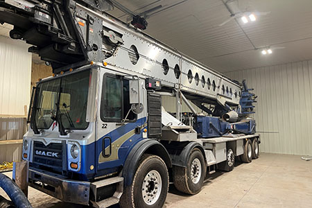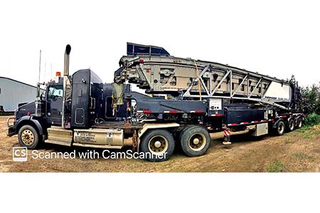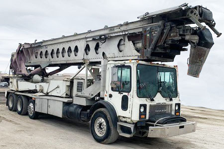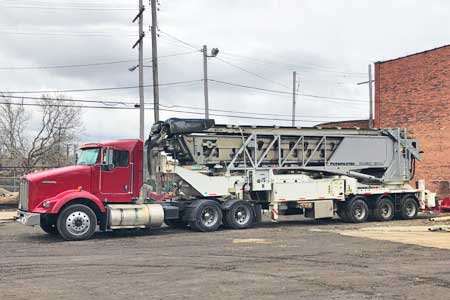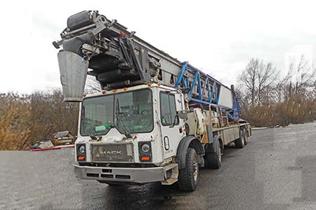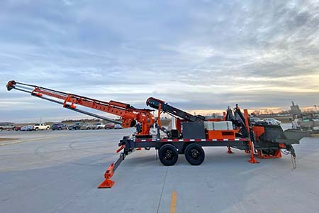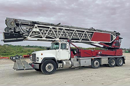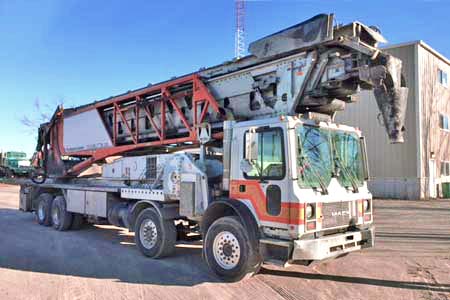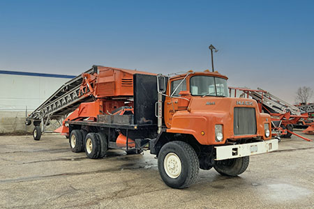 The TB-110 is a larger, truck-mounted, 4-section boom conveyor with 106-feet of horizontal reach and a discharge height at 30-degress of 62-feet. It produces up to 360yds./hour at 0-degrees (flat) and 230yds./hour at 20-degrees and can handle up to 4-inch rock on its 18-inch belts. Despite its size, this model can set up and work at heights under 16-feet.