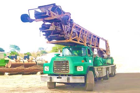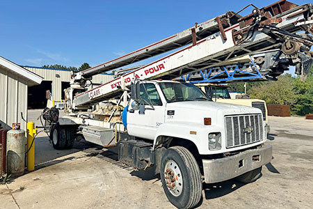 The TB-130 is a very large, truck-mounted, 5-section boom conveyor with 126-feet of horizontal reach and a discharge height at 30-degress of 68-feet. Like the smaller models, It also produces up to 360yds./hour at 0-degrees (flat) and 230yds./hour at 20-degrees and can handle up to 4-inch rock on its 18-inch belts. This model can handle concrete slumps from 0" to 12" and features a patented "quick set-up" outrigger design. Remarkably, this larger model can also set up and work at heights under 16-feet.