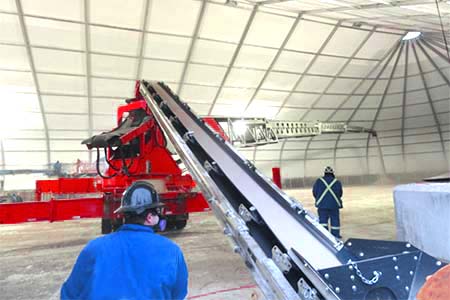 Telebelts employ two conveyor belts - the Feeder Belt, which is hopper-loaded, extends to the ground and discharges material onto the Main-Belt which in turn, places the material. They are also capable of "reverse-placement" because they can be used to remove material - even from otherwise inaccessible places!